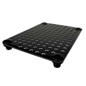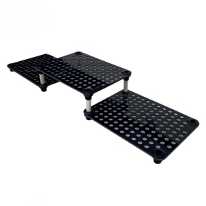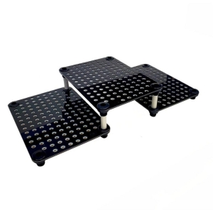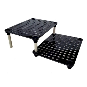 Our high-quality aquarium frag racks are built from black domestic cell cast acrylic with a heavy-duty gray food-grade silicone insert to hold frag plugs in place. The innovative design utilizes four 1/2″ slip bulkheads (included) and the PVC nipple feet allow racks to lock in place within a cooler for transport. Multiple racks can be stacked and tiered in many orientations with adjustable height PVC pieces (PVC not included). Minimalist design will blend with your existing system and not draw attention away from your reef.