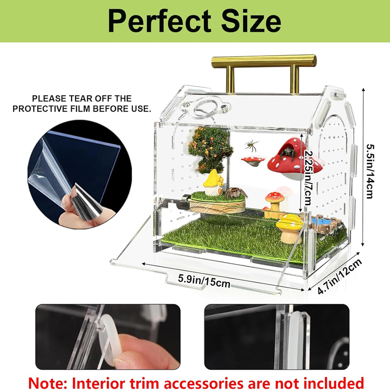 Convenient to Carry: the metal handle design is not only very suitable for taking pets out for play, but the handle can also reduce the vibration generated inside the insect terrarium during transportation, which is very important for sensitive organisms such as jumping spiders, as excessive vibration may cause them stress or discomfort, Please tear off the protective film before use