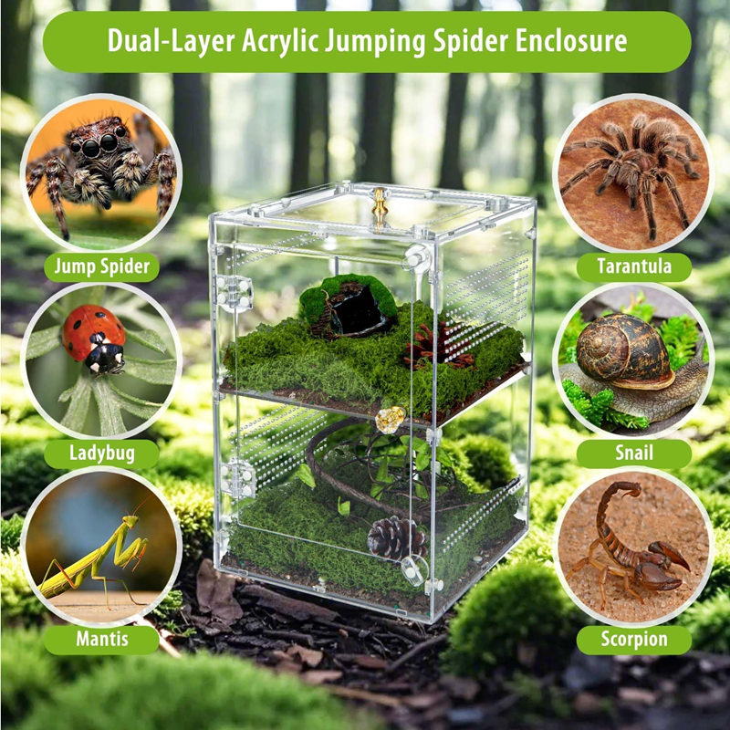 【 Crystal Clear & Breathable 】This jumping spider enclosure is fully transparent for 360°viewing of your pet’s adventures! Strategically placed vents ensure airflow while keeping escapes impossible. Watch their fascinating behaviors without missing a detail