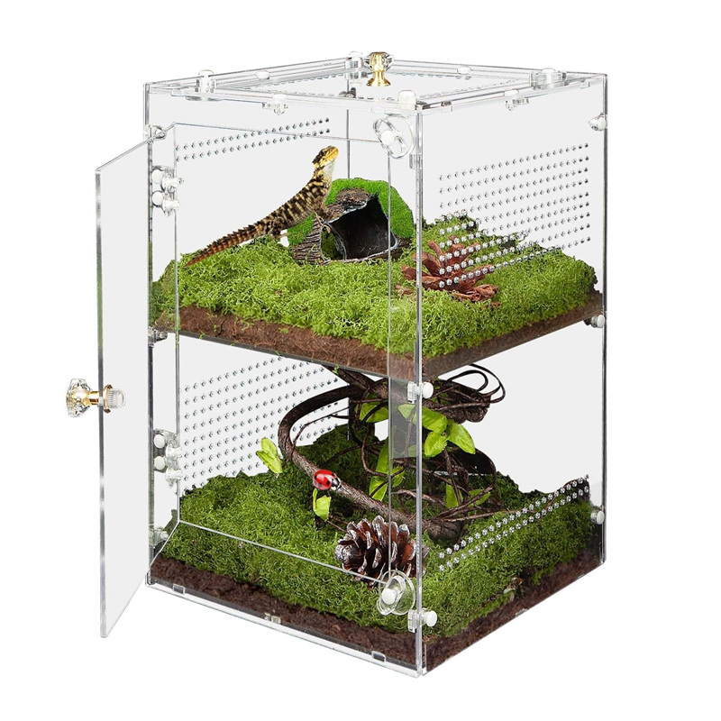 【 Premium Material 】This tarantula enclosure is crafted from thick, scratch-resistant acrylic for long-lasting use. Features front and top openings for easy feeding and cleaning. and the rotatable lock insurance of two locks for doors and multiple rivets prevent pets from escaping well
