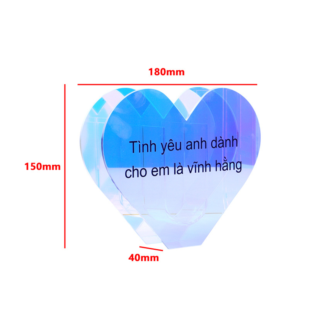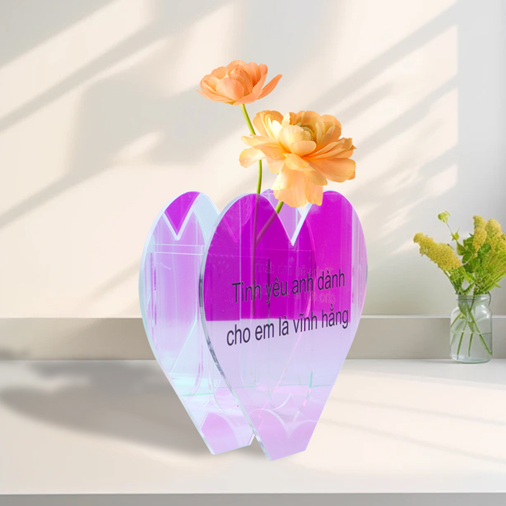 This Iridescent Heart Acrylic Vase captures light and emotion with its captivating multichrome finish . The vase is delicately engraved with the heartfelt Vietnamese phrase “Tình yêu anh dành cho em là vĩnh hằng”(My love for you is eternal), making it a meaningful gift for expressing lasting affection. Crafted from high-gloss, lightweight acrylic, the heart-shaped vessel holds a delicate bouquet of white sweet pea blossoms, symbolizing devotion and bliss.