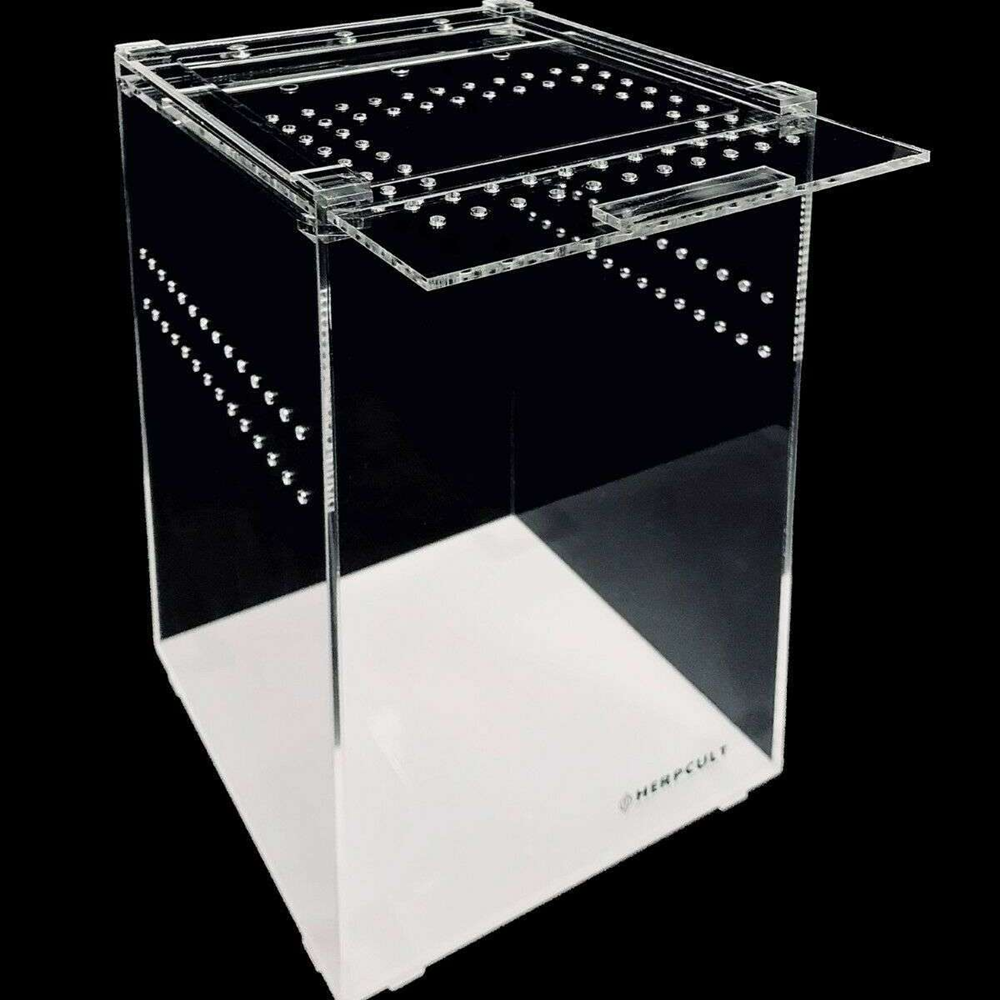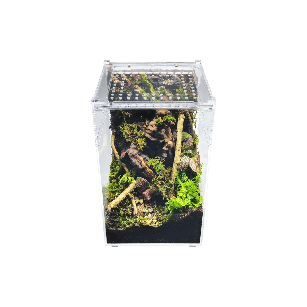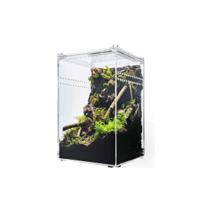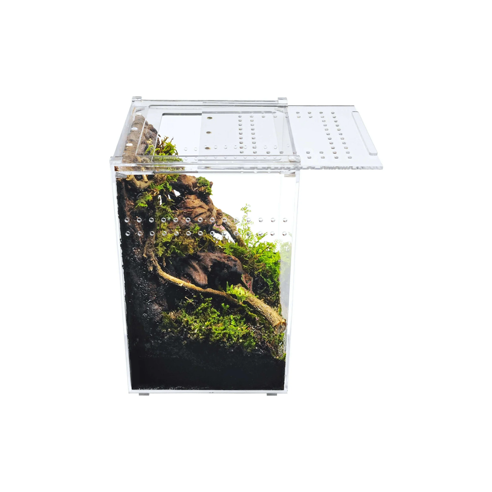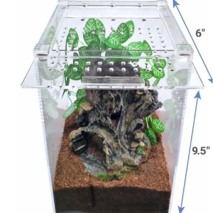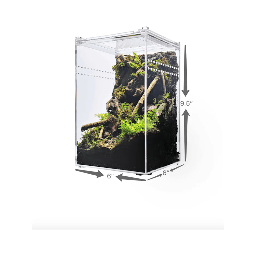 This Small Tall Acrylic Terrarium with Magnetic Lid provides the perfect vertical living space for arboreal pets, featuring a compact 6″x6″x9.5″ footprint that maximizes vertical climbing area while conserving desk or shelf space.