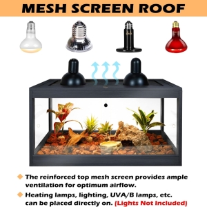 【Practical Design】Our reptile terrarium features a functional design with double sliding front doors, effortlessly opened or secured with a lock to prevent escape attempts. The top is outfitted with reinforced metal mesh, facilitating proper ventilation and enabling the direct placement of heat lamps and UVA/B lights (not included) for optimal temperature regulation.